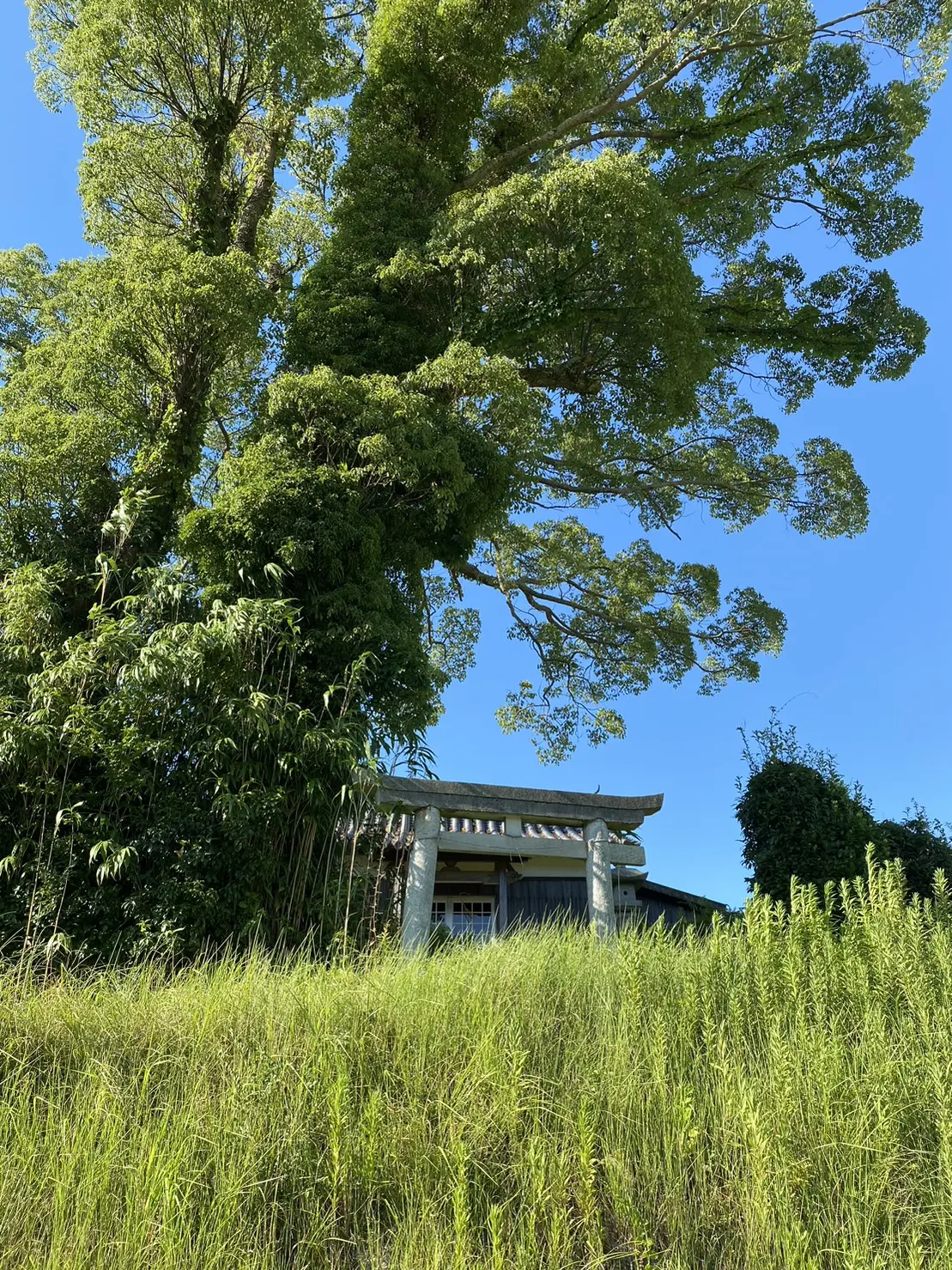 田植えが終わった犬の散歩道の集落と、小さな祠、曇天もまた、風情があります。